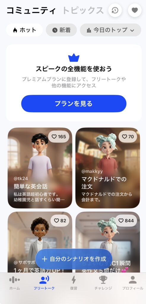 自分でカスタムシナリオを作ることもでき、「明日のプレゼンのリハーサル」や「特定の状況での会話練習」など、ピンポイントで必要な練習ができるのも魅力です。