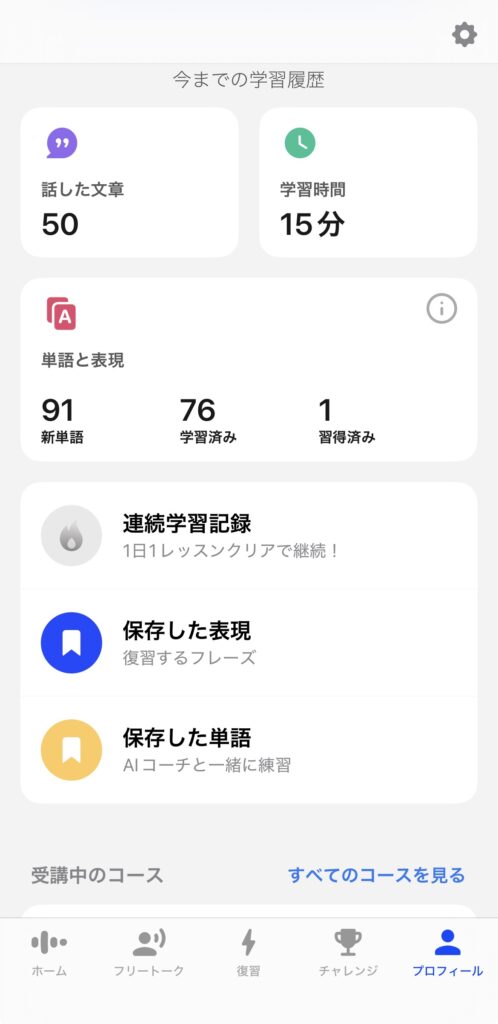 スピークでは学んだ単語や表現の数、学習時間・連続学習記録などを自動保存してくれる機能がついています。