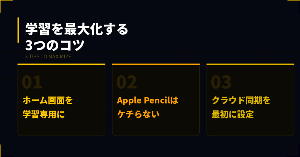 最初に設定しておけば、iPhoneやMacからも学習データにアクセスでき、「移動中にiPhoneで復習→帰宅後にiPadで深掘り」といった学習動線が完成します。