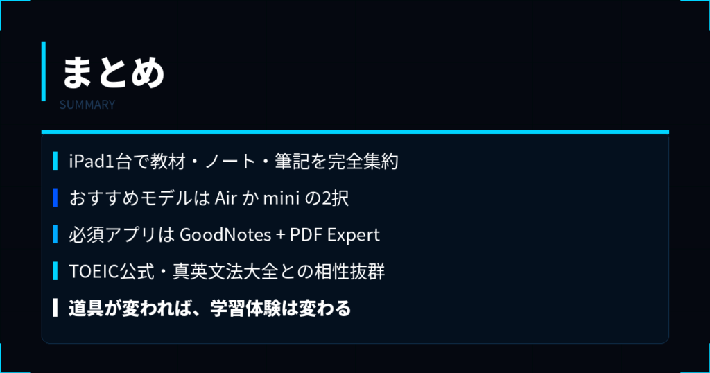 iPadは決して安い買い物ではありませんが、「英語学習を続けるためのインフラ」として考えれば非常にコスパの良い投資です。